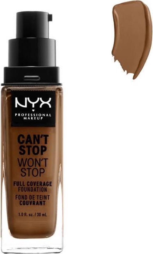 Lichtgewicht, waterproof en super gepigmenteerd. NYX Professional Makeup’s Can’t Stop Won’t Stop Full Coverage Foundation Sienna CSWSF17.5 werkt net zo hard als jij. Deze comfortabele, vloeibare foundation is er in 45 verschillende kleuren en is transferproof. Elke kleur is smooth aan te brengen en laat een matte finish achter die de hele dag blijft zitten. De foundation werkt hard om jouw huid te matteren en om een glimmend gezicht tegen te gaan. Ook verstopt hij de poriën niet en is de foundation te gebruiken voor normale, vette, combinatie en gevoelige huidtypes.Gebruik de Concealer en Setting Poeder uit dezelfde Can’t Stop Won’t Stop lijn, om je look helemaal af te maken.Dit product van NYX Professional Makeup heeft een Vegan Formule, wat wil zeggen dat het geen ingrediënten of bijproducten van dierlijke oorsprong bevat.