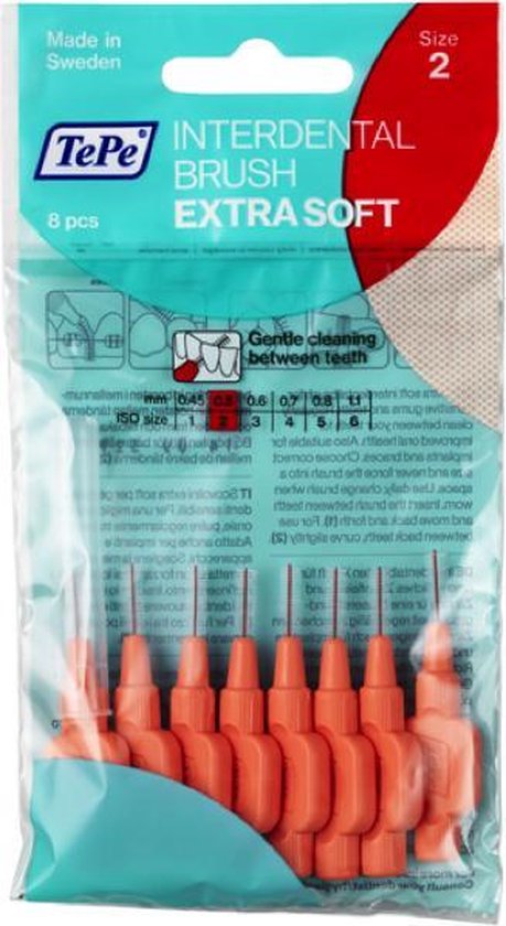 De TePe Interdentale rager extra soft heeft speciaal geselecteerde, extra zachte borstelharen voor een optimale mildheid. Aanbevolen bij gevoelige mondslijmvliezen en/of tandhalzen en diverse soorten ontstekingen van het zachte weefsel, zoals gingivitis. Ook geschikt rondom implantaten of eenvoudigweg voor wie de voorkeur geeft aan een zachtere rager. Het dagelijks gebruiken van een interdentale rager, als aanvulling op het tandenpoetsen, is een eenvoudige en efficiënte manier om uw tanden en tandvlees fris en gezond te houden. Reinigen met een interdentale rager voorkomt tandvleesontstekingen, gaatjes en een slechte adem. Deze lichtrode rager heeft een draad maat van 0,5 mm en een borsteldiameter van 2,6 mm. De reeks TePe Interdentale ragers extra soft is verkrijgbaar in 6 kleur gecodeerde maten, geschikt voor zowel de kleine als de grote interdentale ruimte. Alle maten zijn voorzien van een plastic gecoate metalen draad.